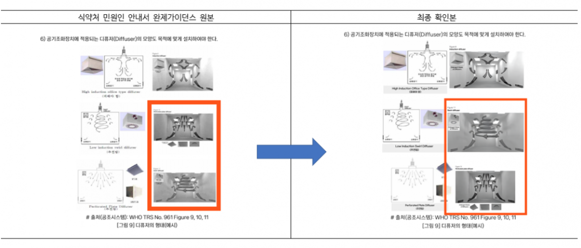 다만, WHO 가이드와 비교해 본 결과 swirl diffuser와 perforated plate diffuser의 그림이 서로 바뀐 것으로 확인되었습니다.