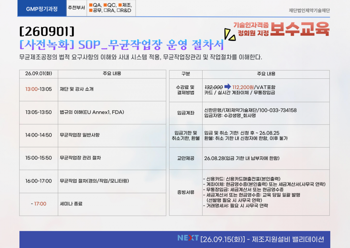 [2026.09.01] (보수교육) (사전녹화) SOP_무균작업장 운영 절차서